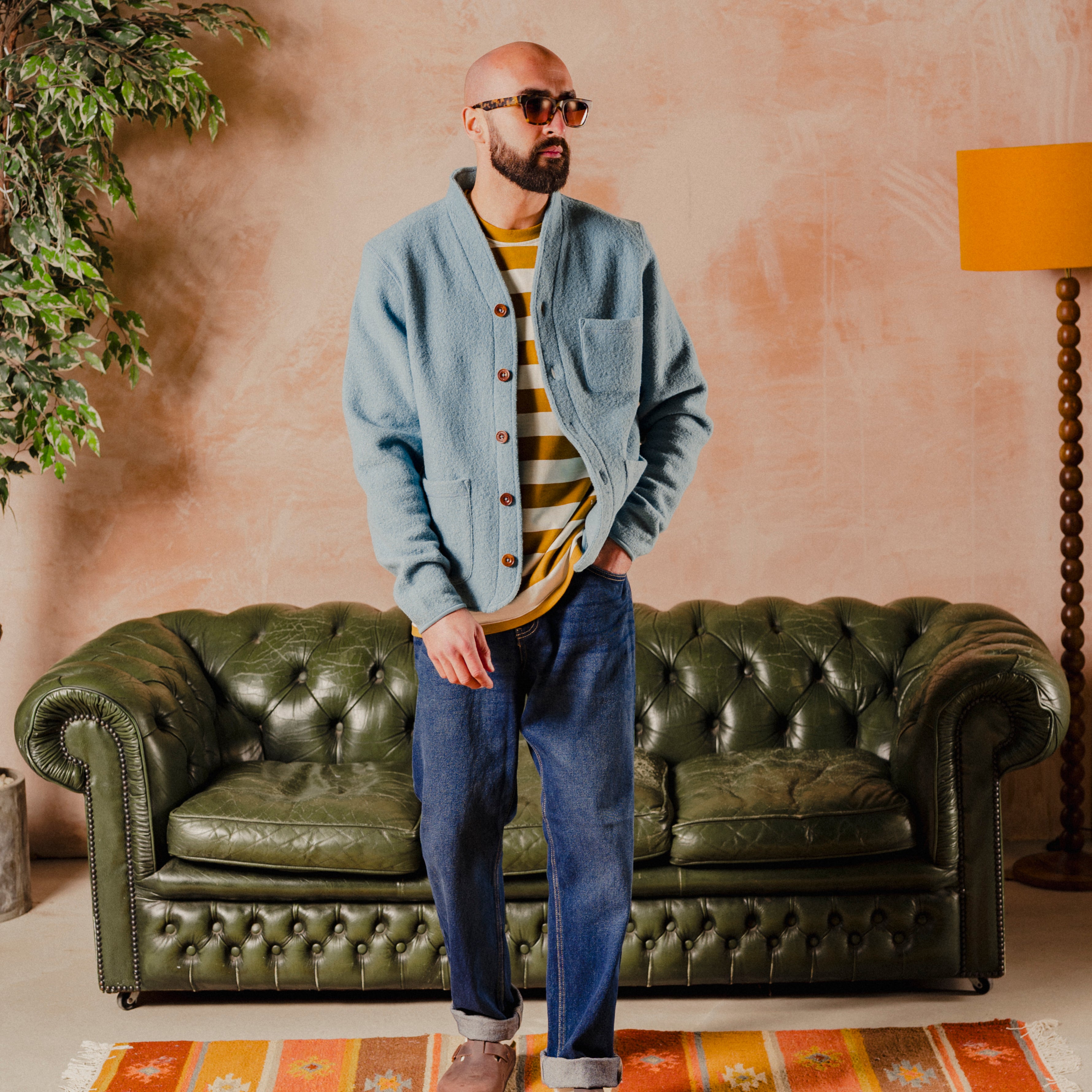 Man wearing a mustard yellow wool cardigan and dark jeans standing against a plain white wall.