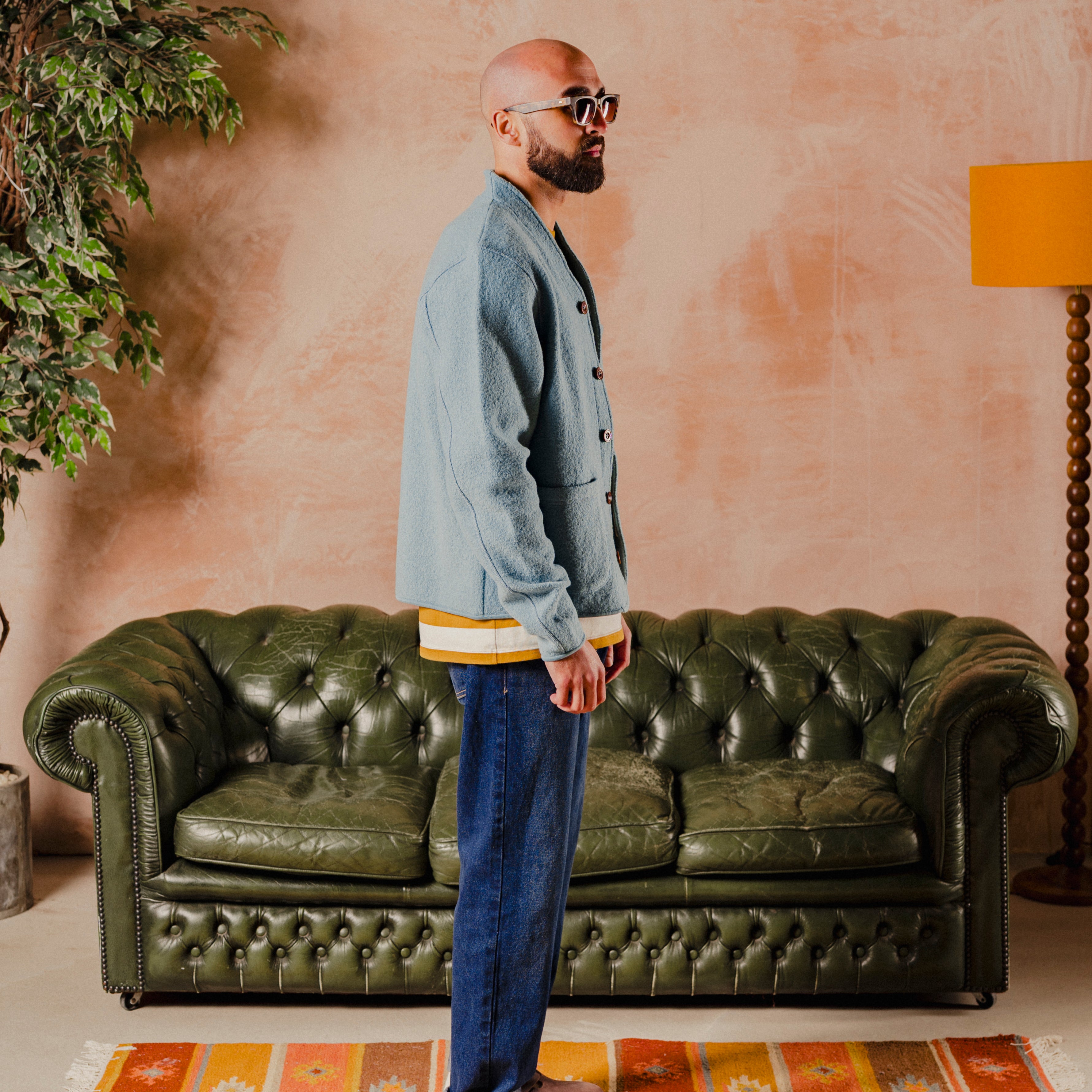 Man wearing a blue cardigan in a room with a painting and lamp in the background