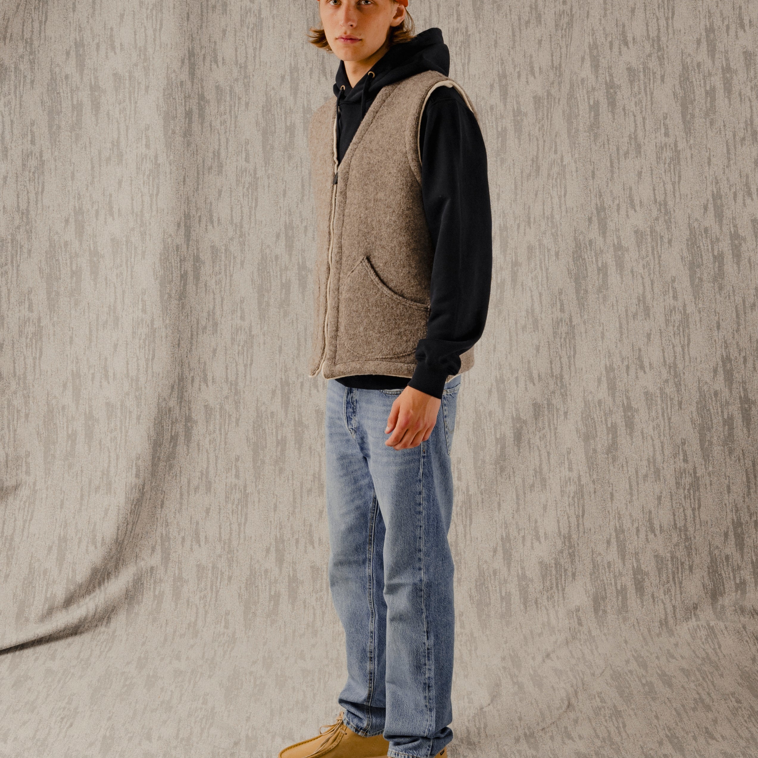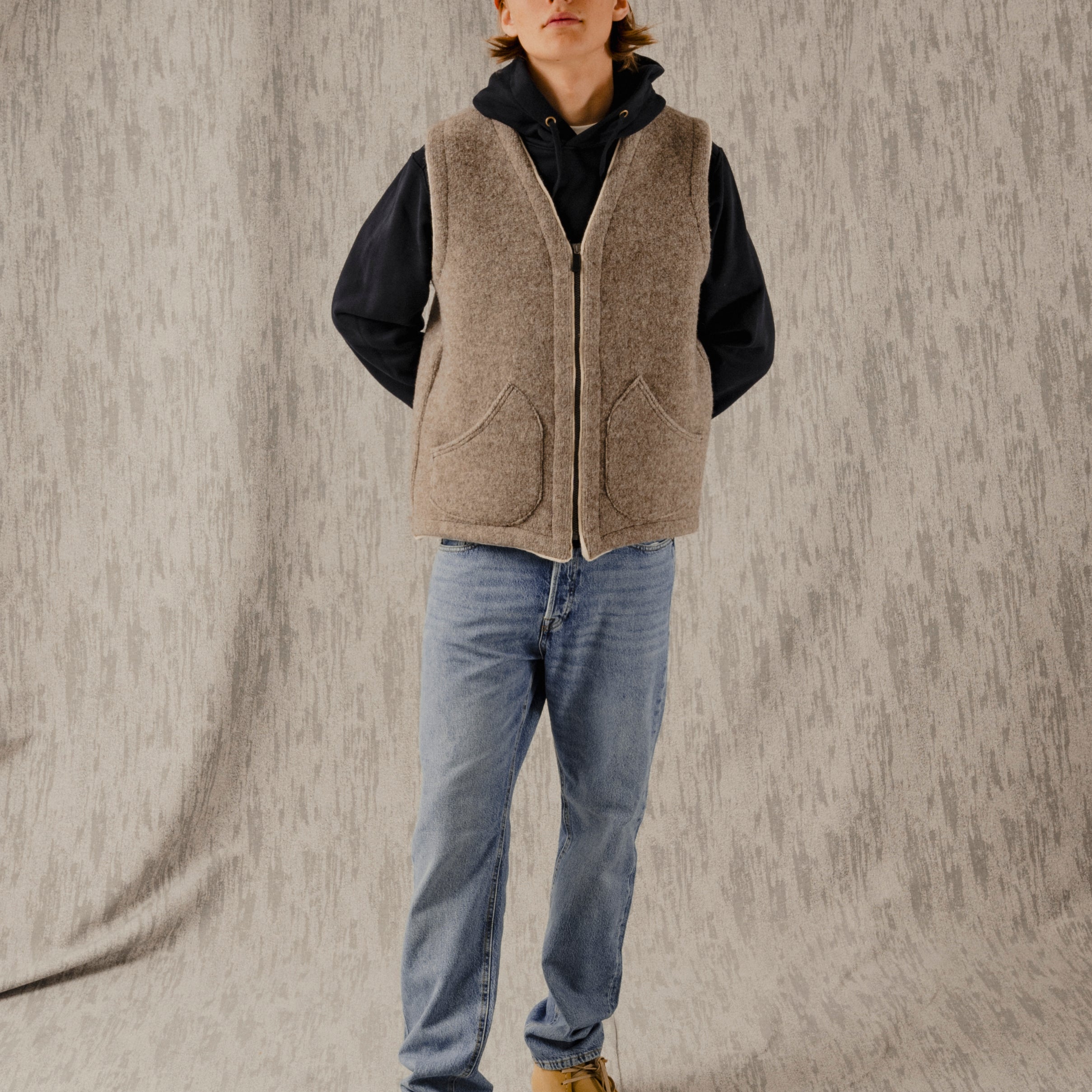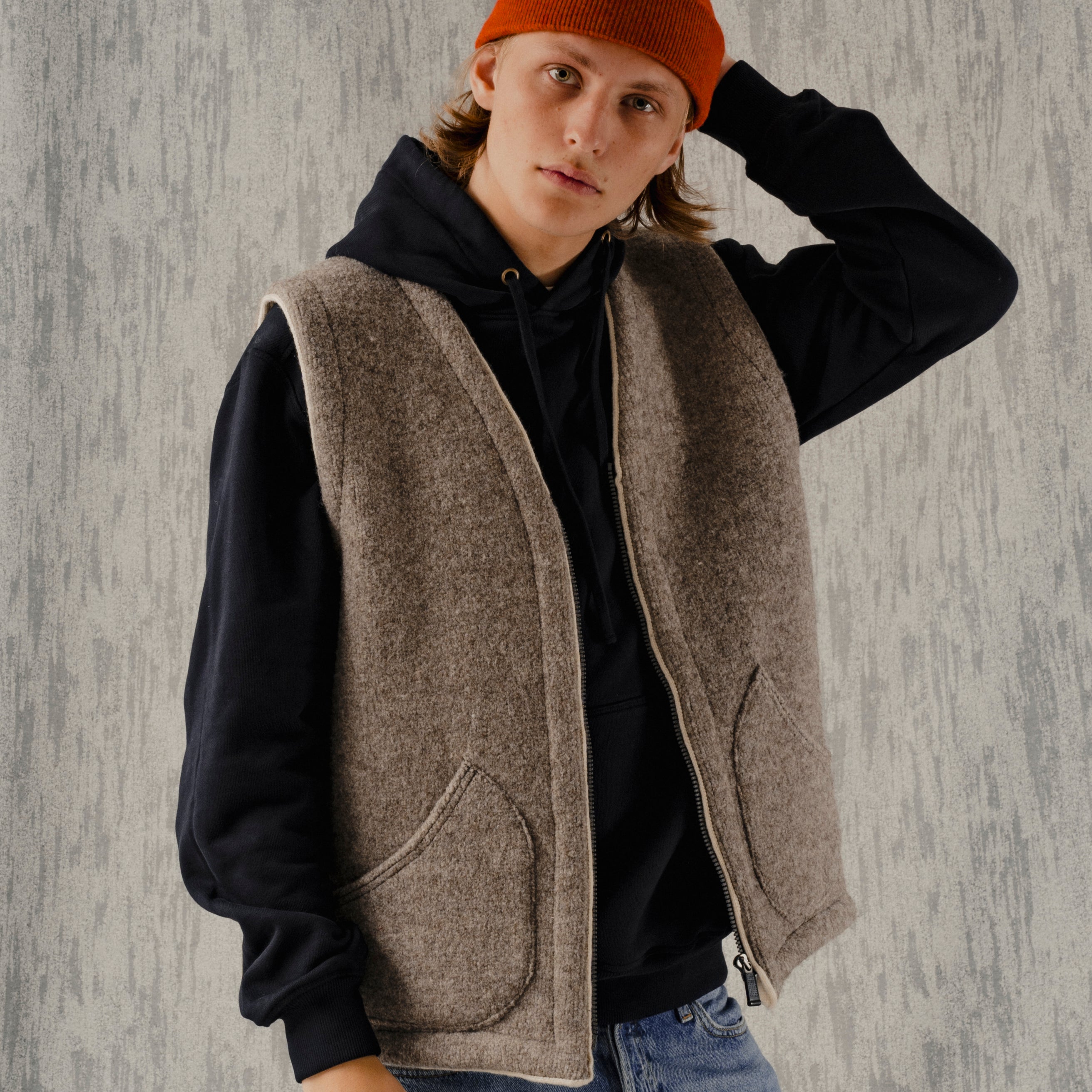 Man wearing a light gray wool vest over a white t-shirt with a cap in an indoor setting
