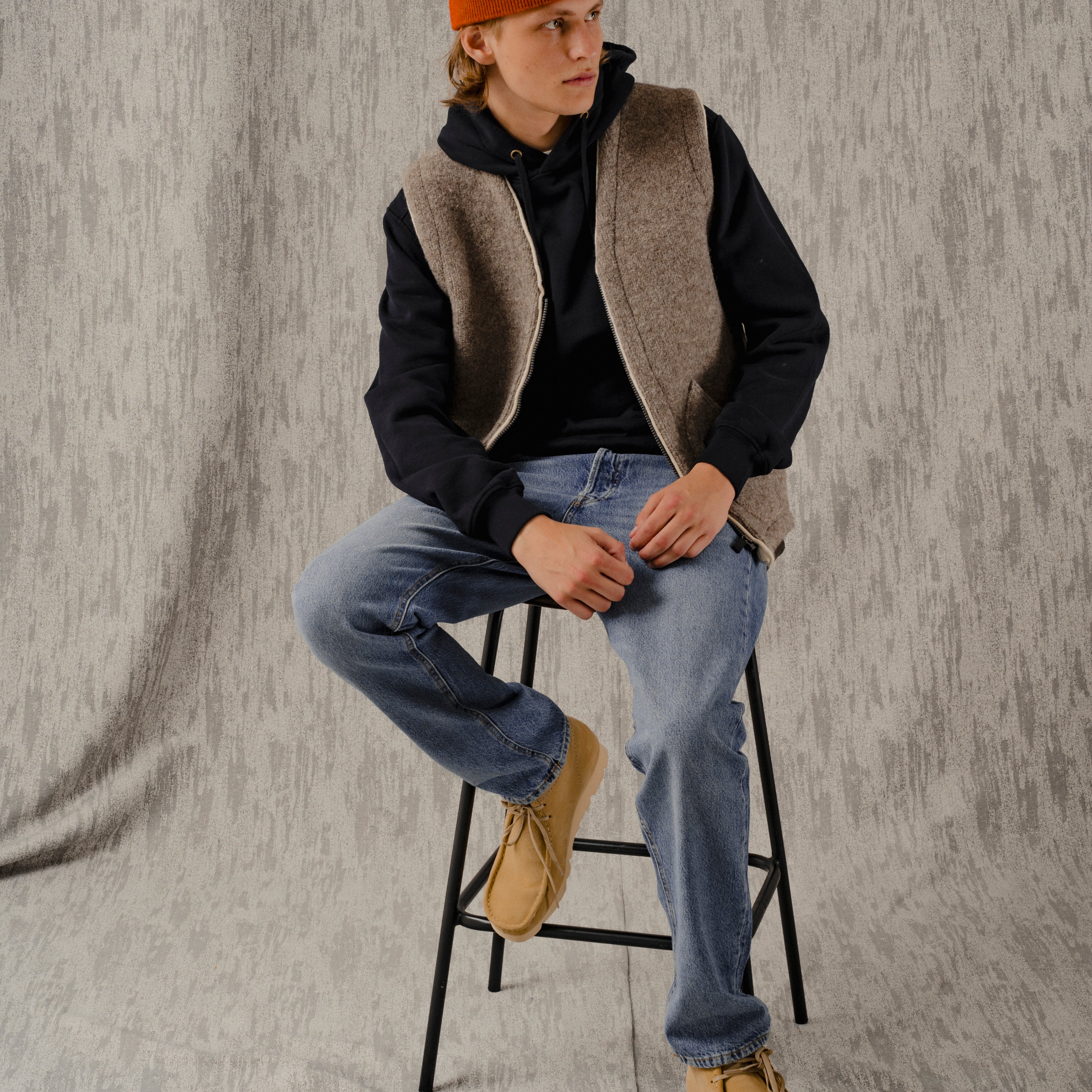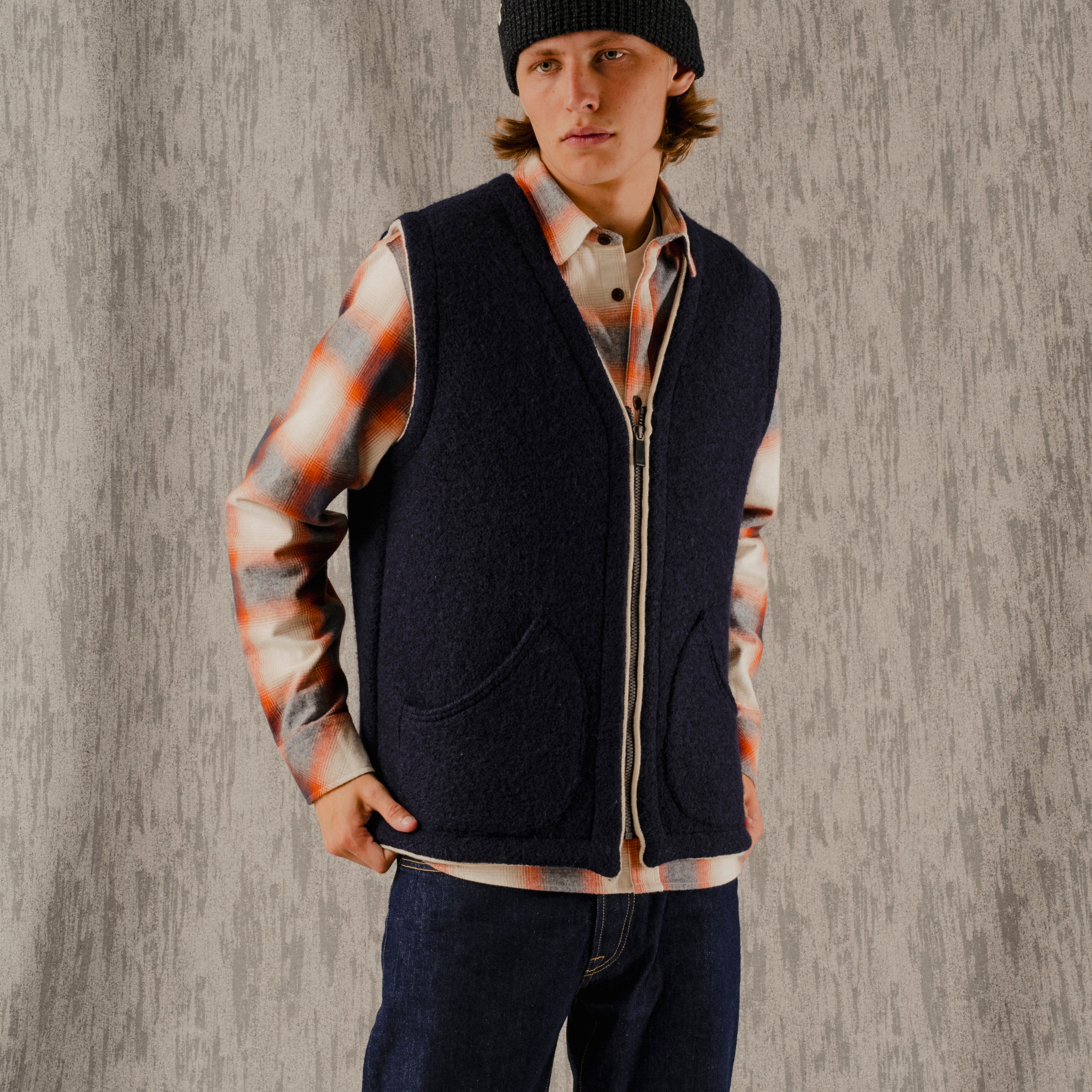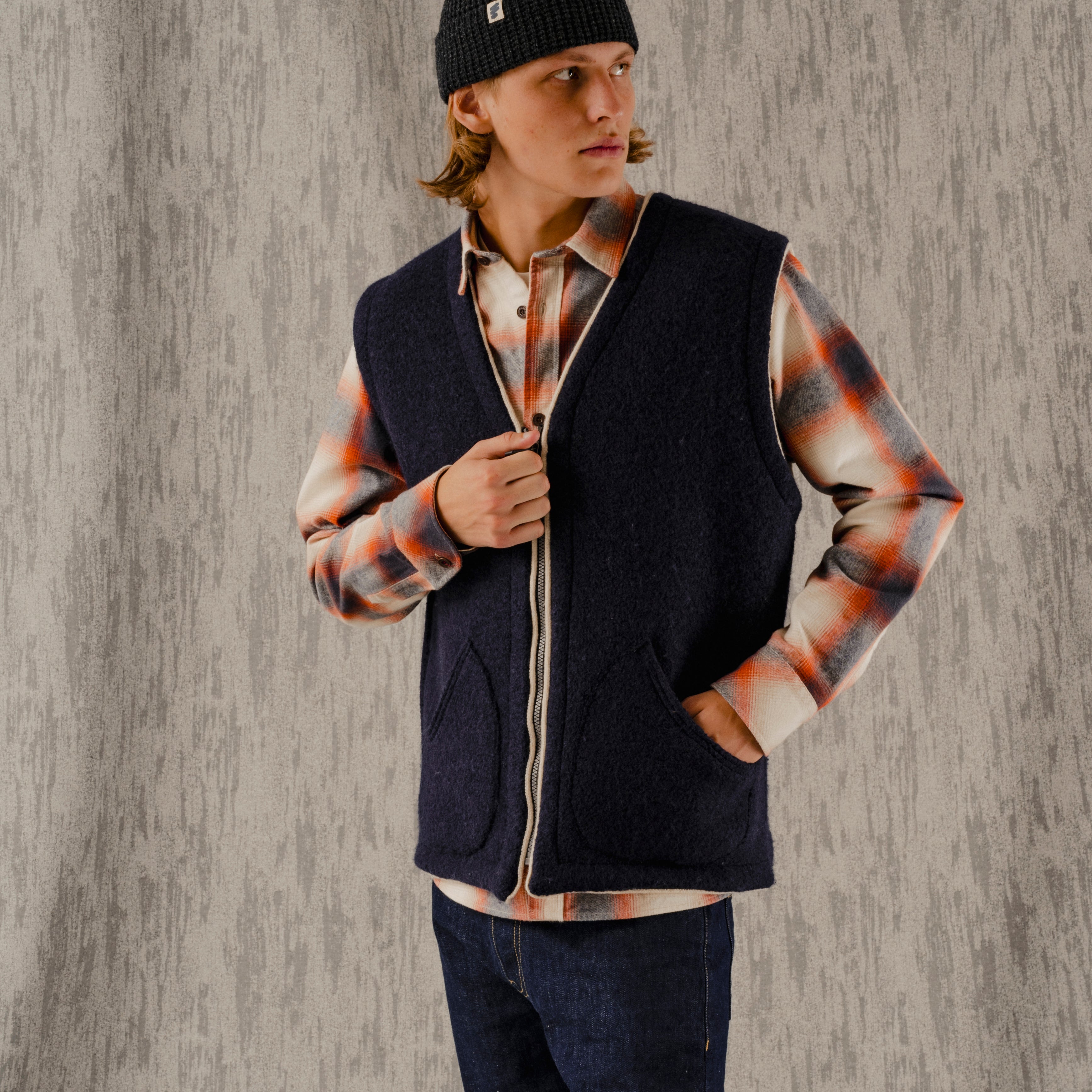 Man wearing a light gray wool vest over a white t-shirt with a cap in an indoor setting