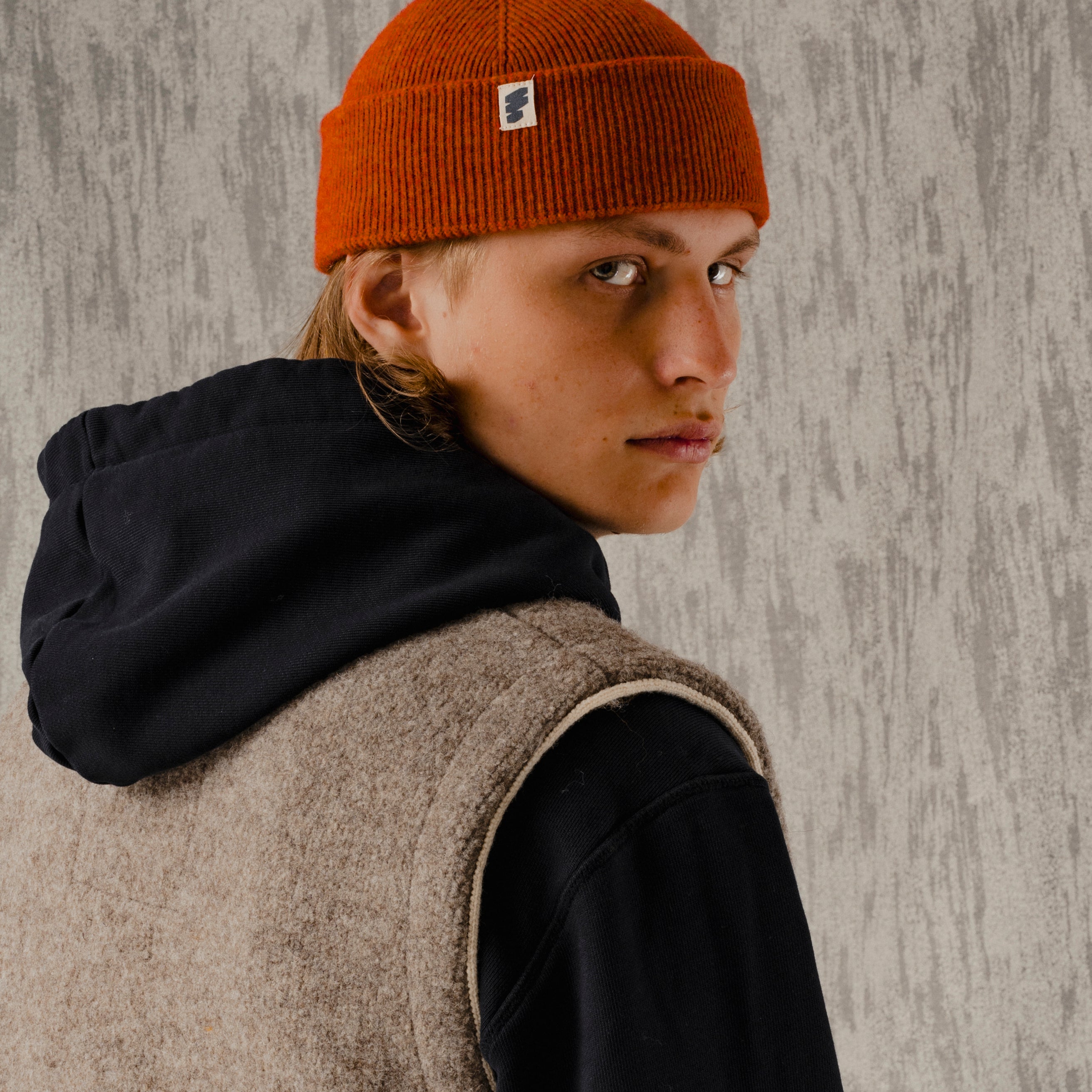 man sat on a stool wearing an orange wool knit crewneck with dark blue denim jeans and a navy blue wool beanie