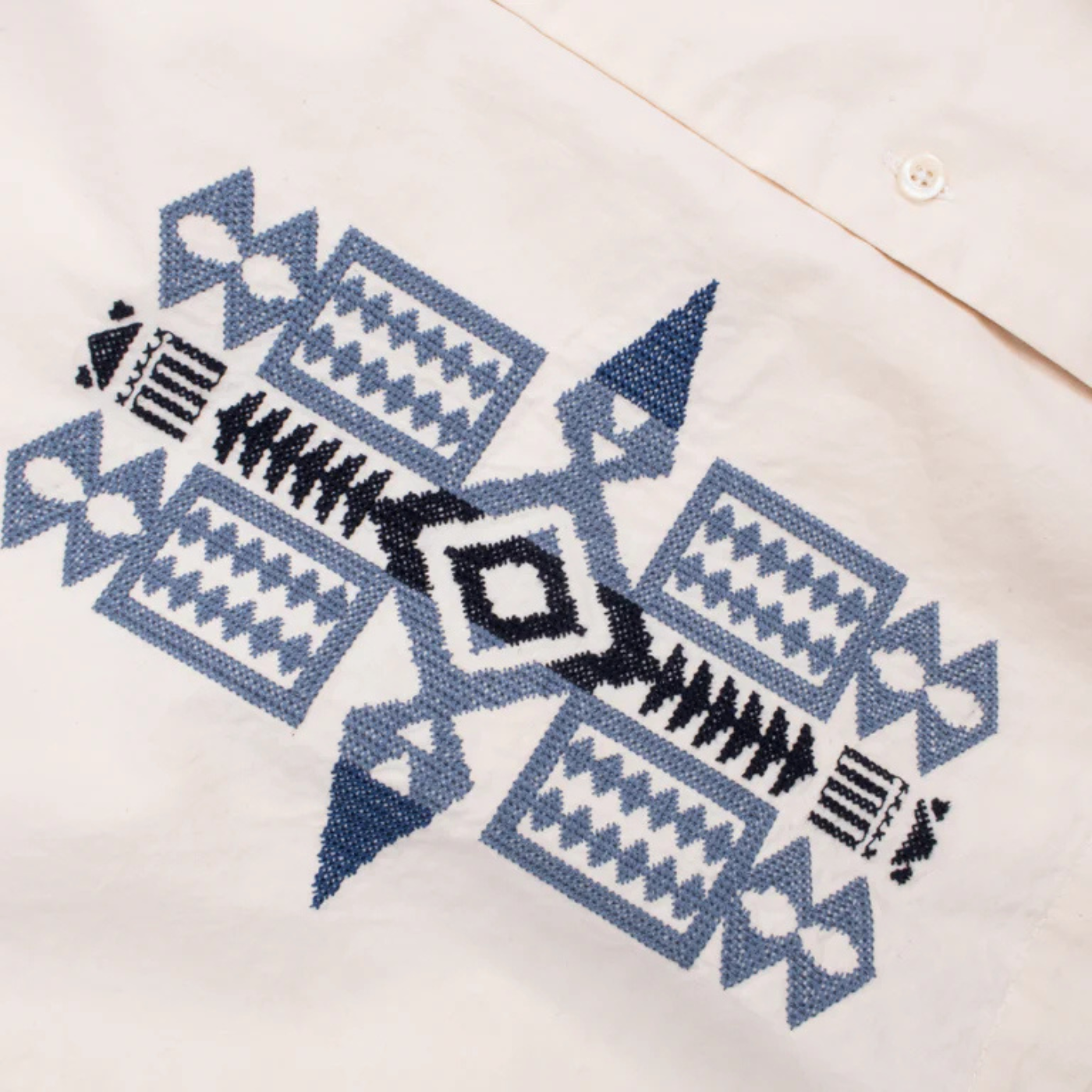 A throwback to the traditional workwear shirts of yesteryear. This has an open, Cuban style neckline in a solid textured cotton. All adorned with Pendleton needlework detail on the pockets.