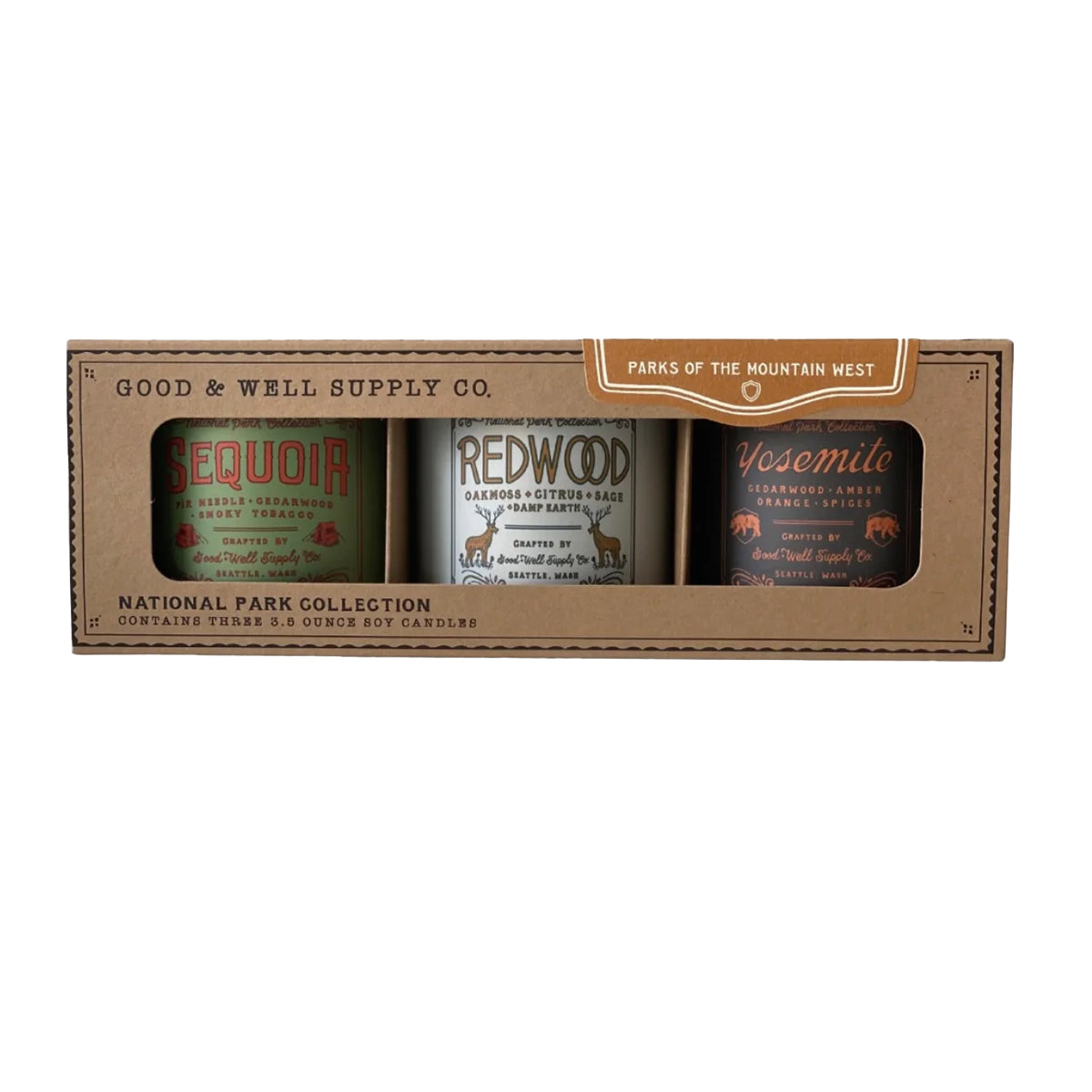 These gift-able sets of three, 4 oz. candles represent some of the most visited regions and National Parks around America. Though they're petite, these candles are mighty; boasting Good & Well classic National Parks scents that are sure to fill the room with all the scents of the Great Outdoors. Plus, they look great in our ready-to-gift topographical kraft boxes!