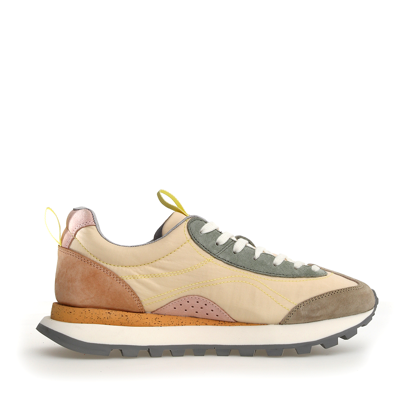 Low-top sneakers with outdoor shoe-inspired construction: the technical fabric upper is complemented by suede inserts, perforated detailing at the sides, and reinforced leather and technical grosgrain eyelets. The antibacterial cork insole provides comfort all day long, while the ultra-light rubber sole has a two-tone compound, a moulded edge and an indented tread for perfect grip.