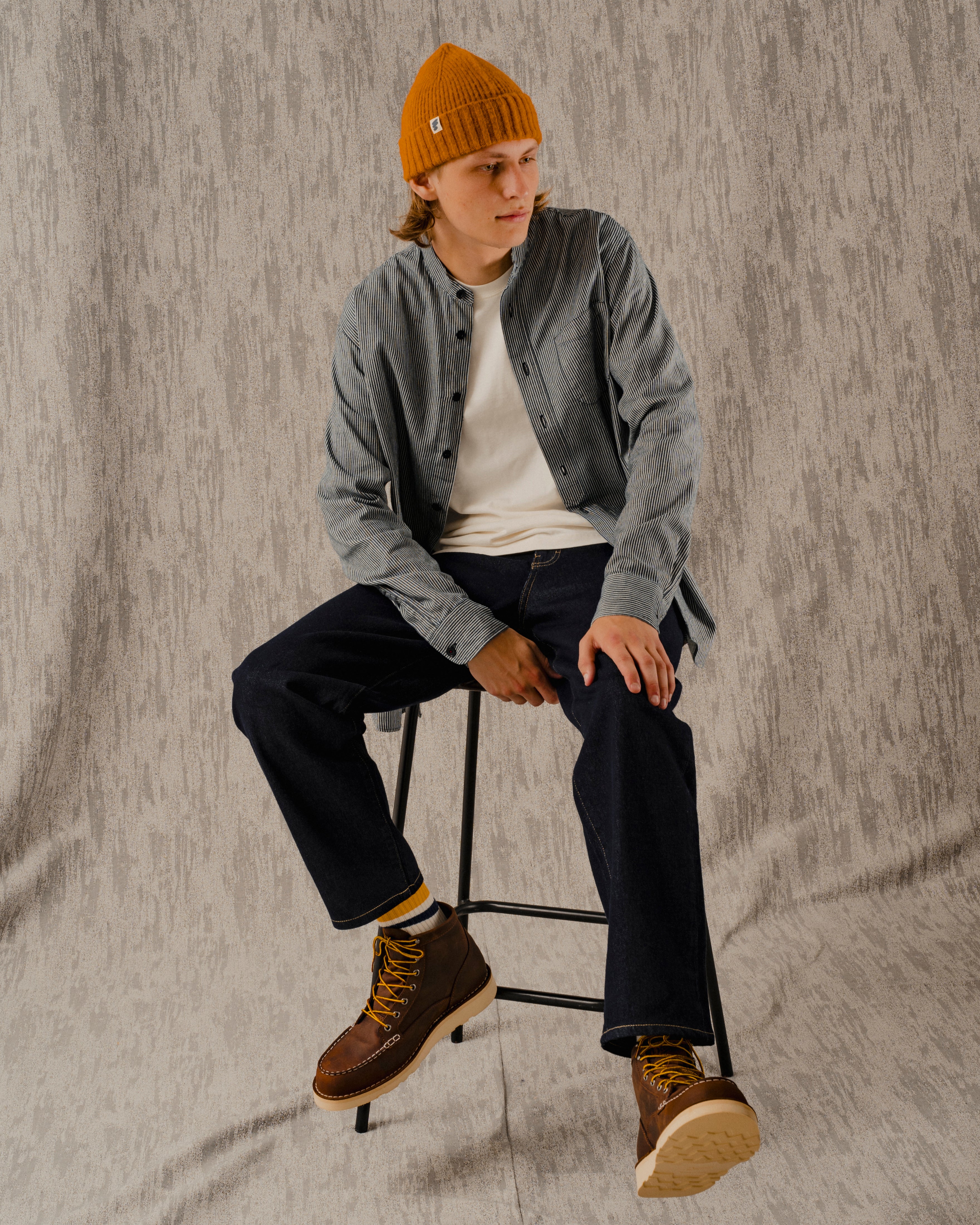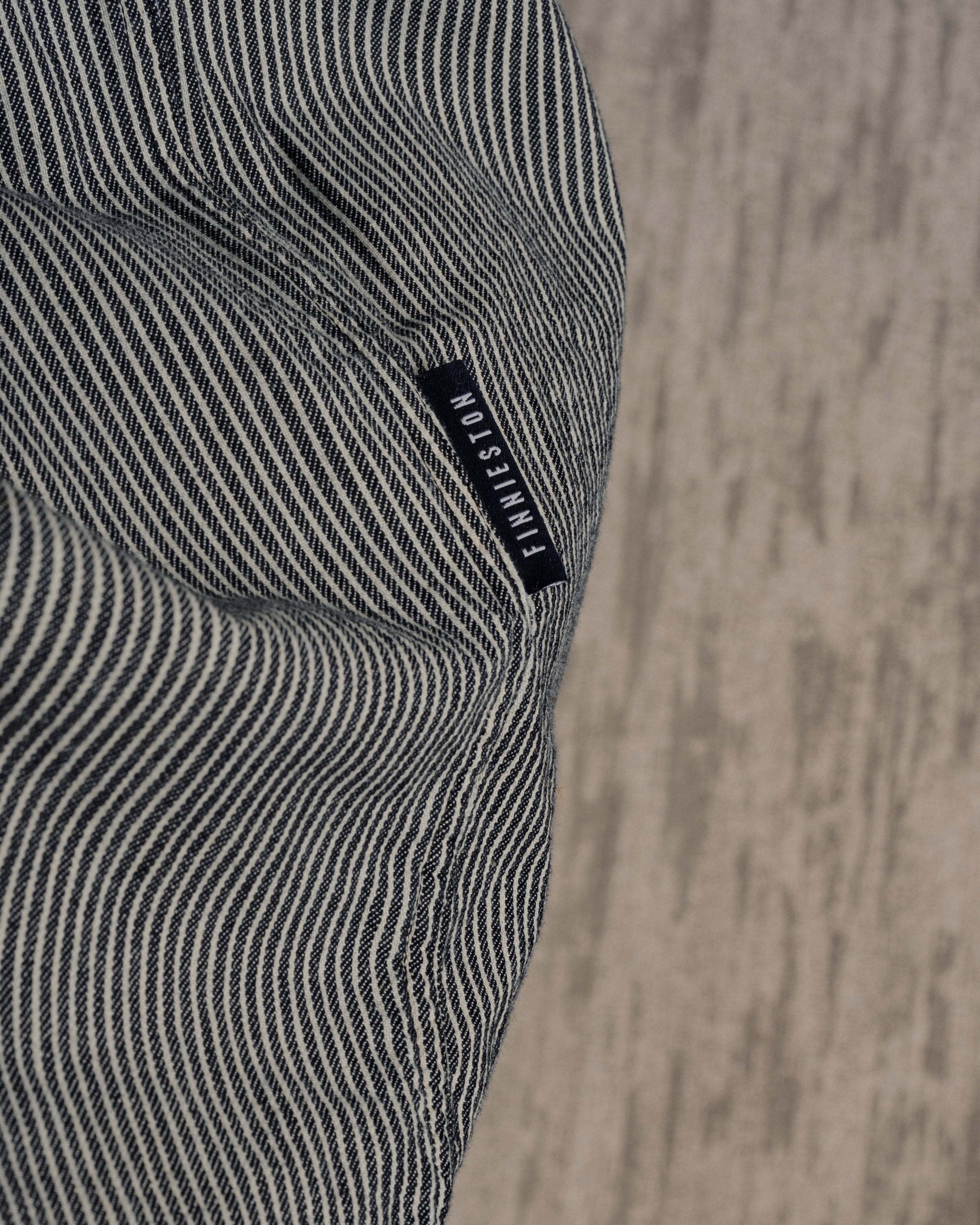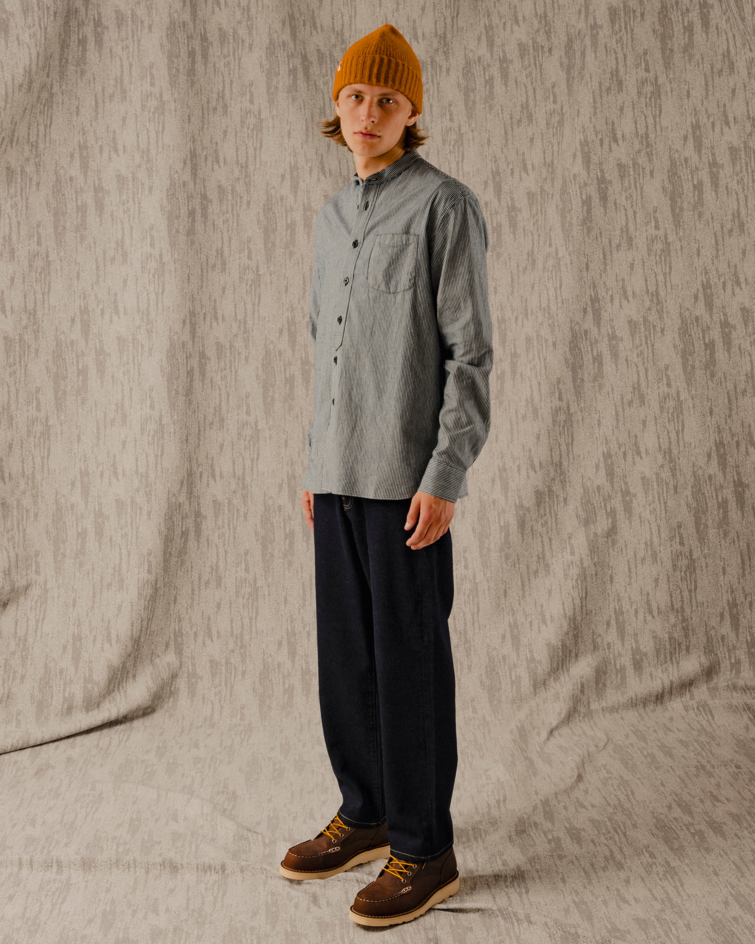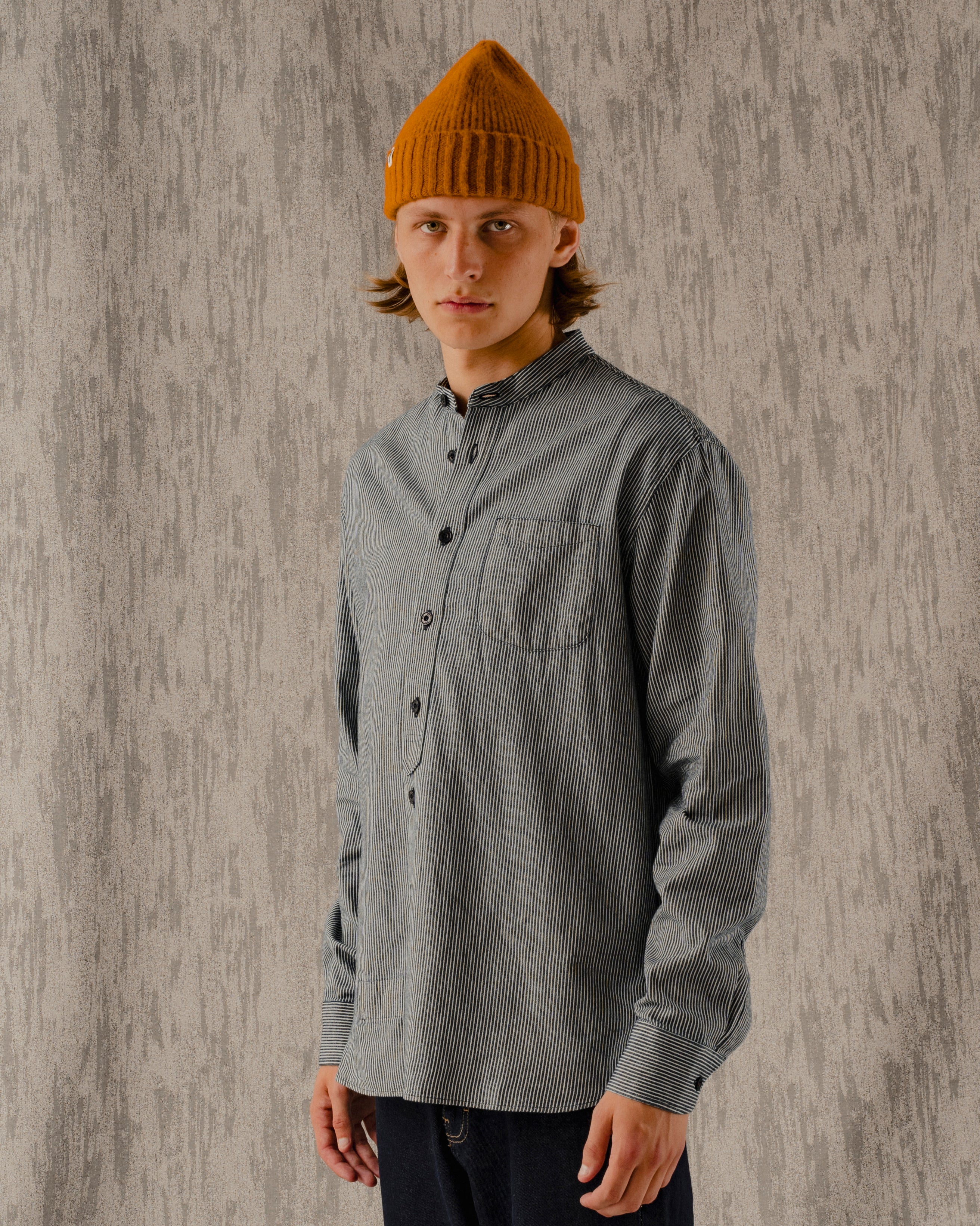 The Clifton Collarless Shirt in a Hickory fabric. A versatile long sleeved shirt with it's roots in workwear and the military. The Clifton is a dressier option, which looks good on its own, beneath our Yardley Jacket or even under a blazer. Roll the sleeves up and leave the top button undone for a more casual look.