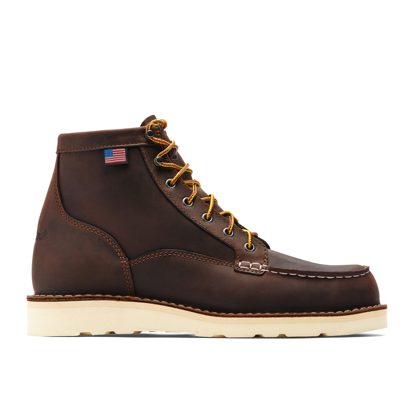 The Danner Bull Run Moc Toe 6" in Brown boot delivers dependable comfort and durability for demanding environments. Crafted in the USA using full-grain, oil-tanned leather, this unlined boot moulds to your foot over time, providing a personalised fit. Its handcrafted stitchdown construction ensures stability and longevity, making it a reliable choice for various work settings.