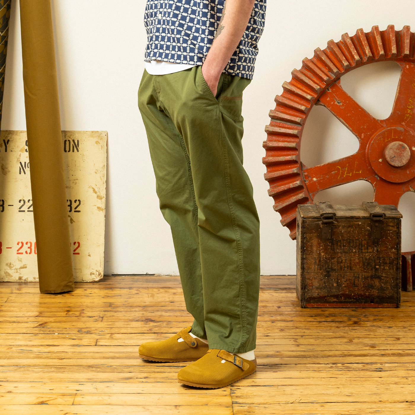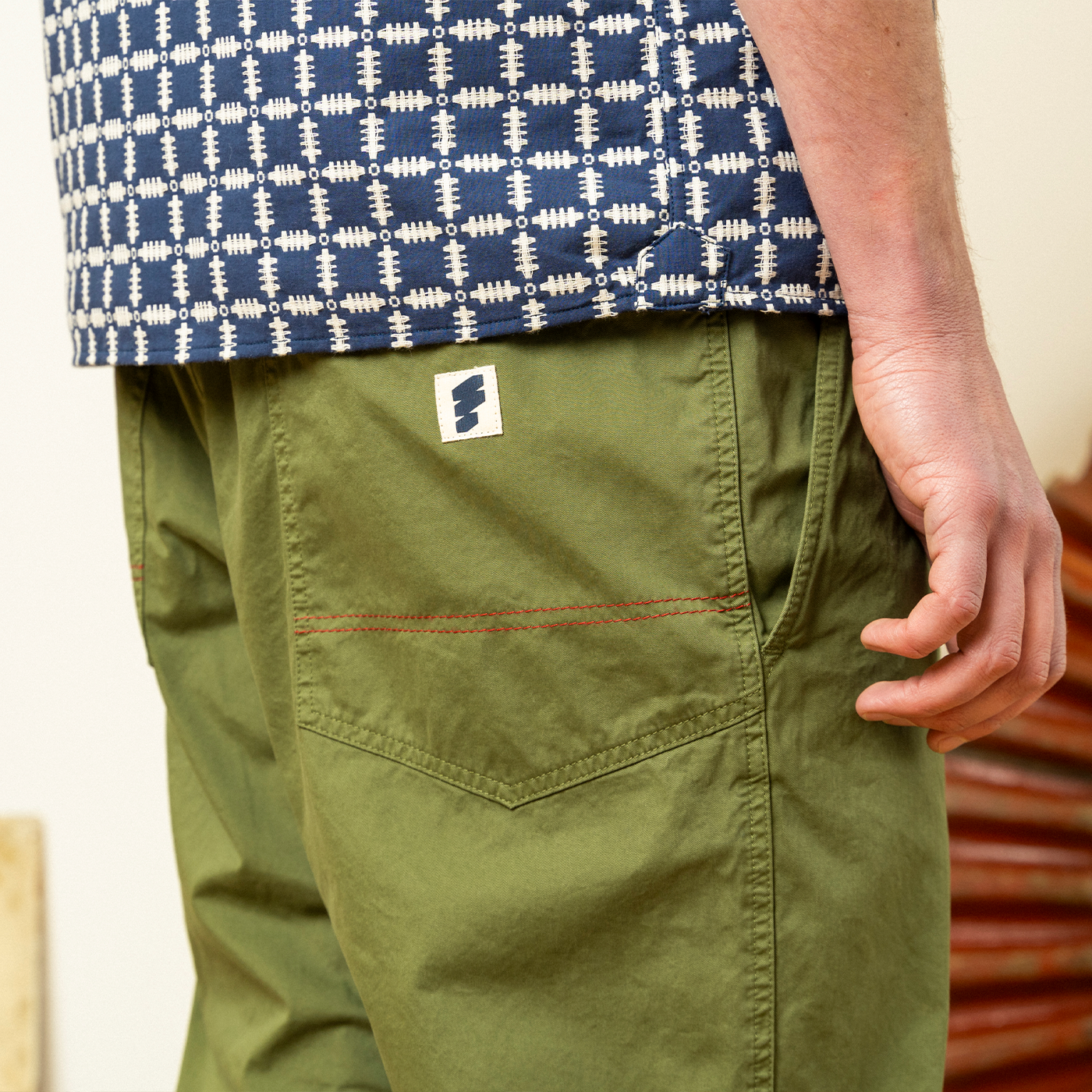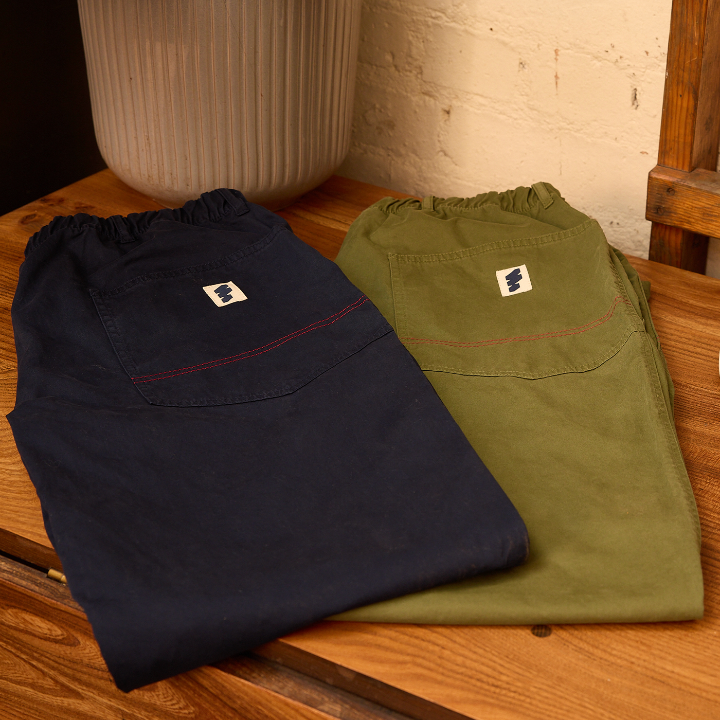 The Ashton Work Pant in a durable garment-dyed Organic Cotton in a classic Olive Green colourway. Button fastening with zip fly. The Ashton is a loose fitting pant for maximum manoeuvrability and comfort. Elasticated waistband helps when looking for a more relaxed fit, belt loops for when you need them to stay put. Deep side entry and rear pockets finished with signature Finnieston contrast stitching.