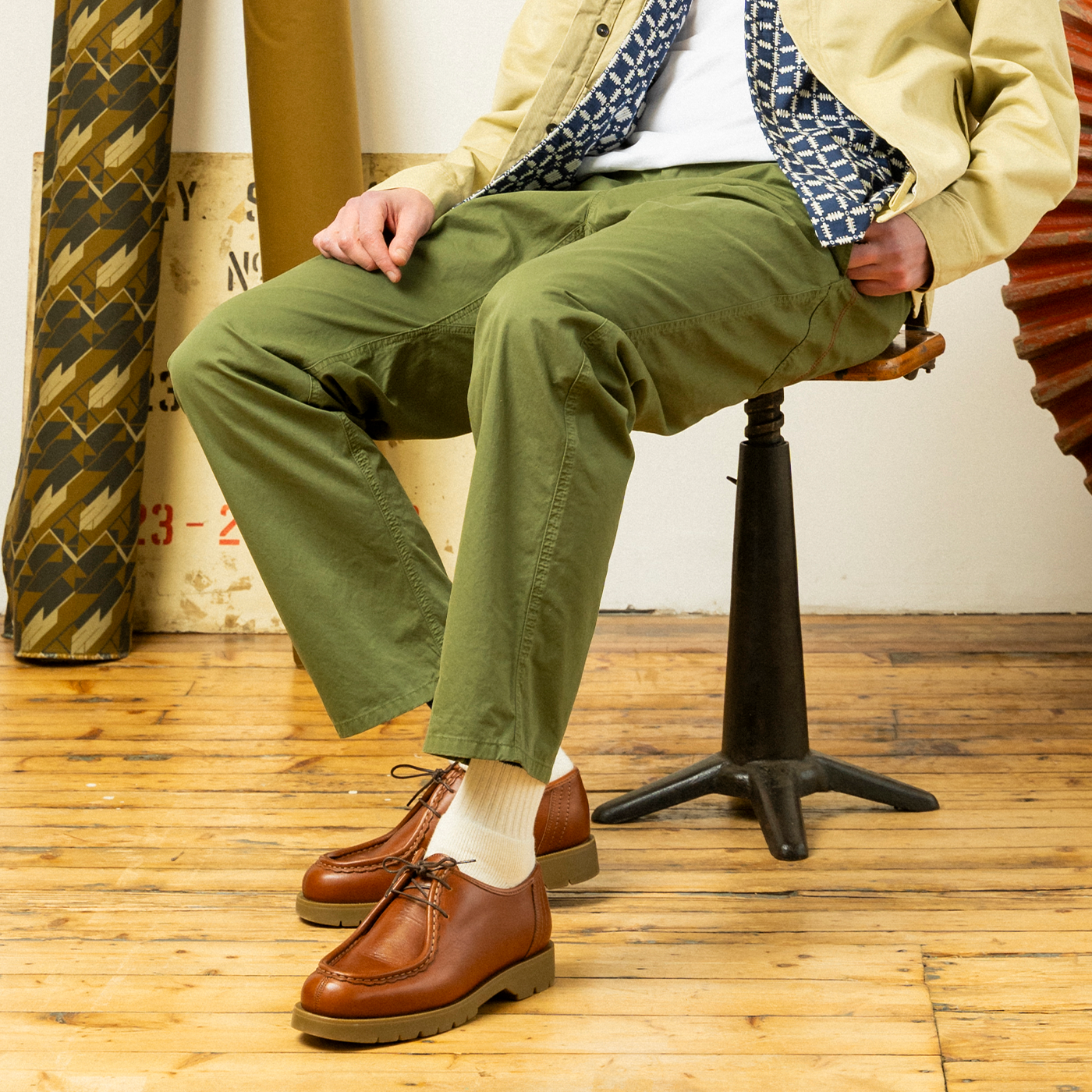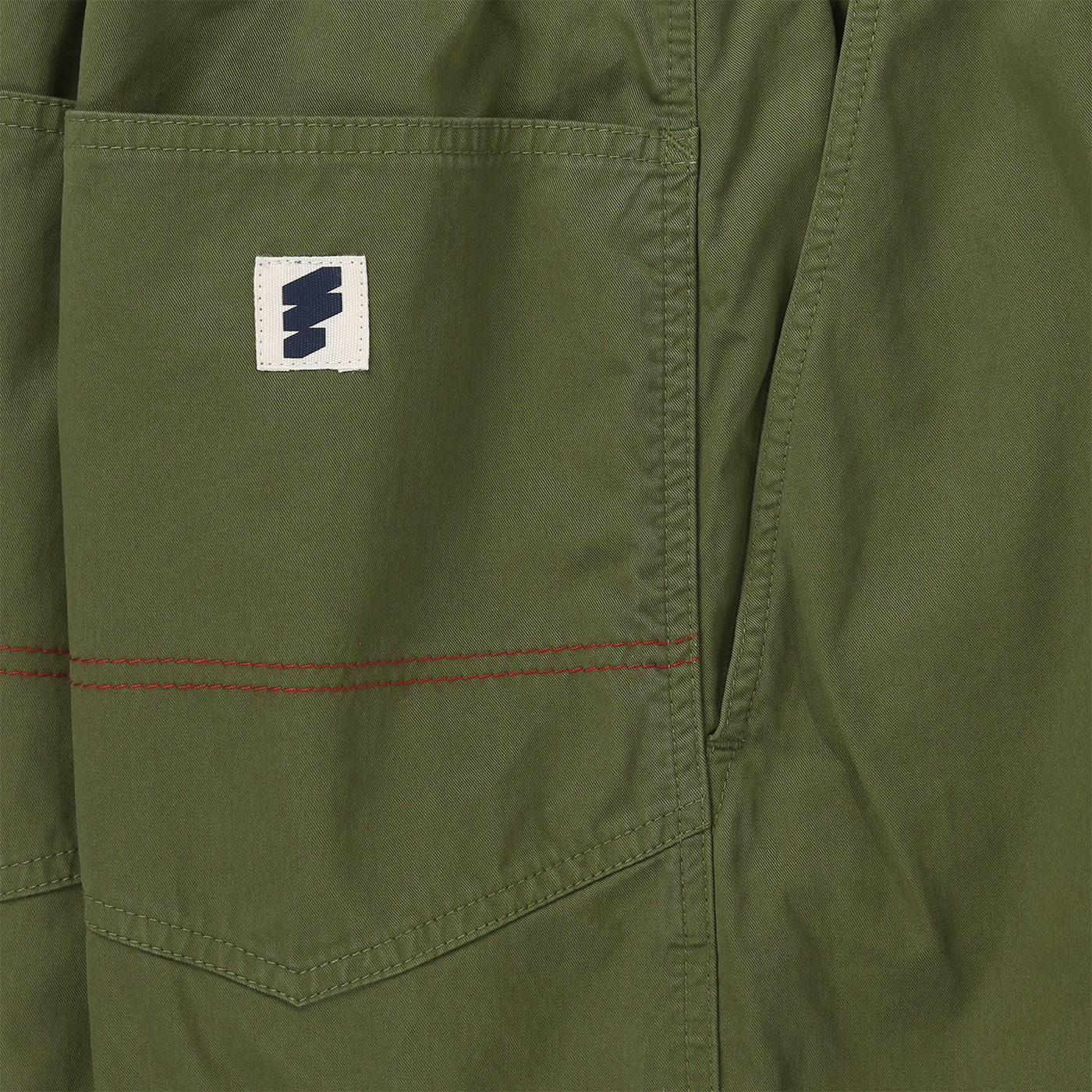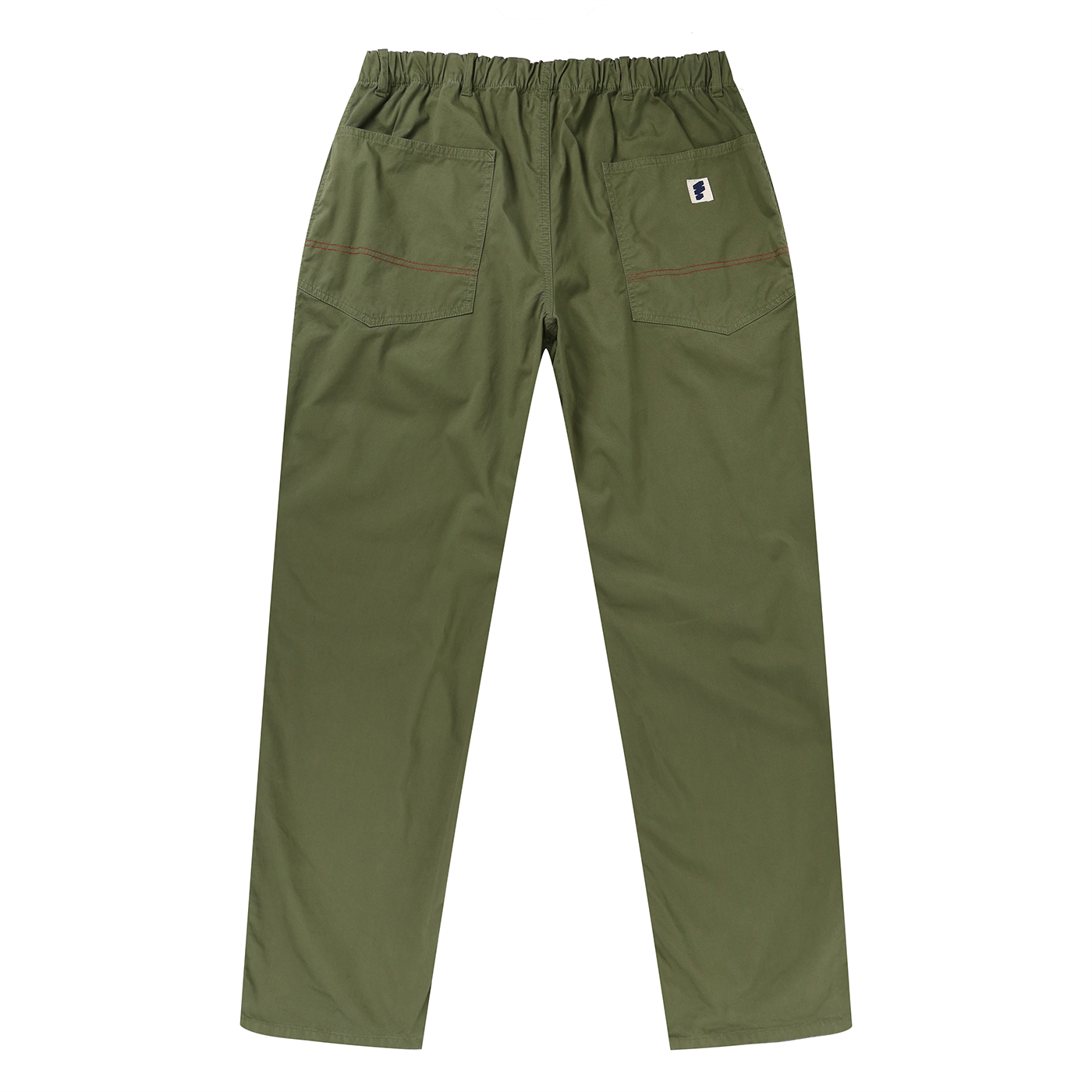 The Ashton Work Pant in a durable garment-dyed Organic Cotton in a classic Olive Green colourway. Button fastening with zip fly. The Ashton is a loose fitting pant for maximum manoeuvrability and comfort. Elasticated waistband helps when looking for a more relaxed fit, belt loops for when you need them to stay put. Deep side entry and rear pockets finished with signature Finnieston contrast stitching.